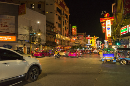 Chinatown , Bangkok , Thailand -March 26 , 2017: traffic with colored billboard in Yaowarat road,famous street of Chinatown