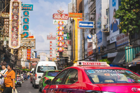 Road traffic on Yaowarat, a famous Chinatown of Thailand