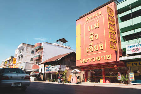 Bangkok, Thailand - April 10th, 2018 Chinatown with notable Chinese buildings, restaurants and decoration.