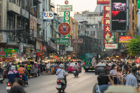 Bangkok, Thailand - March 16, 2023: Domestic people, tourists, bikes and cars on street Yaowarat road in Chinatown district in the evening. Glowing lights and chinese signboards