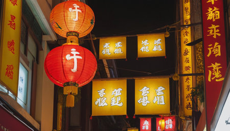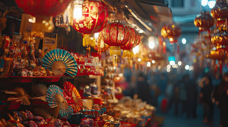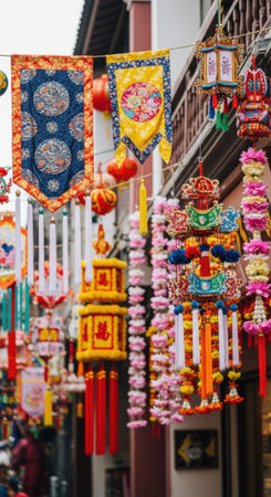 Colorful traditional chinese lanterns and decorations in a festive market