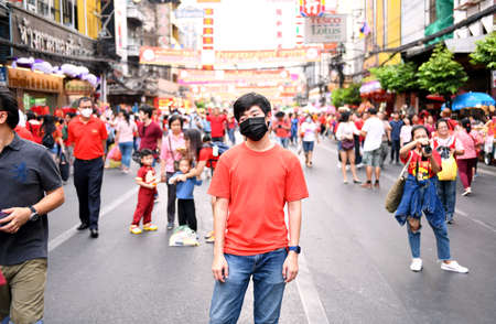 The young man wearing a black mask on the face for protection against dust and viruses (COVID-19) , wearing a red dress went to visit a traditional Chinese New Year at Chinatown (Yaowarat) 2020, Bangkok, Thailand January ‎25, ‎2020, â€â€Ž5:27:40 PM