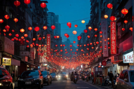 Jewellike Red Lantern Glow Illuminates Busy Evening Street A Captivating Night Scene of Urban Life