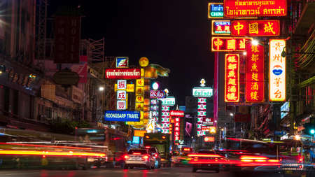 BANGKOK, THAILAND - SEPTEMBER 27, 2015: Traffic on Yaowarat Road passes below lit signs in the Chinatown district at dusk.