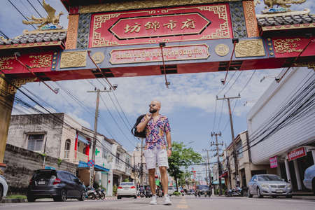 Travelers on street Phuket old town with Building Sino Portuguese architecture at Phuket Old Town area Phuket, Thailand. Travel concept