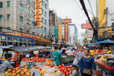 BANGKOK, THAILAND - APRIL 23, 2019: The chaotic activity on Chinatown's evening market next to Yaowarat Road, on April 23 in Bangkok, Thailand