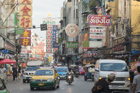 BANGKOK, THAILAND - OCTOBER 23, 2016: Cars and shops on Yaowarat road, the main street of China town in Bangkok