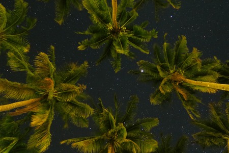 Four palm trees stand tall against a dark blue sky, their leaves illuminated by the moon