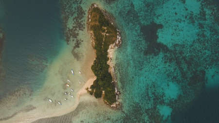 Aerial view of beautiful tropical island with sand beach, azure water. Seascape:Tropical lagoon with turquoise water. Beautiful tropical beach on the island. Philippines. Travel concept.
