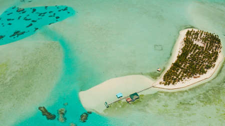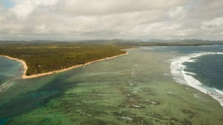 Aerial view of tropical beach on the island Siargao, Philippines. Beautiful tropical island with sand beach, palm trees. Tropical landscape: beach with palm trees. Seascape: Ocean, sky, sea . Philippines. Travel concept.