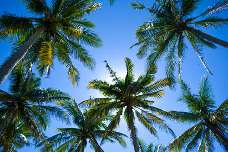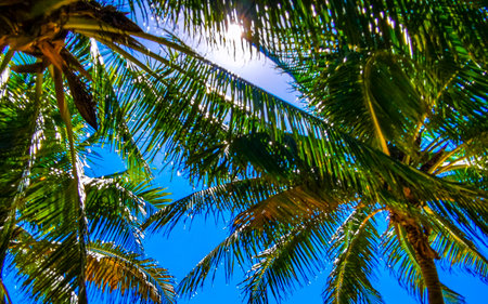 Tropical natural Mexican palm coconut tree palms trees with blue sky background in Caribbean Playa del Carmen Quintana Roo Mexico.