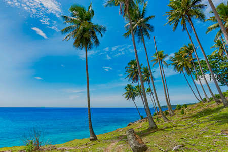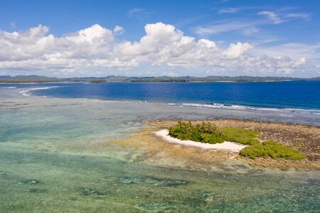 Seascape, coast of the island of Siargao, Philippines. A small island with a white beach and palm trees. The nature of the Philippine Islands.