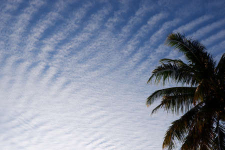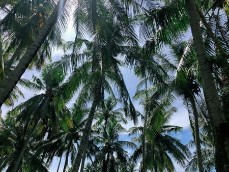 A grove of palm trees and sky with clouds in summer day on the coastline. Holidays in the tropics. High quality photo