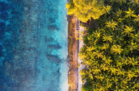paradise tropical beach with turquoise sea water and palm trees, aerial drone top view beautiful landscape