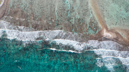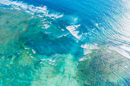 Seascape: blue ocean and surf waves crashing on a coral reef top view. Summer and travel vacation concept