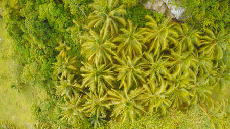 Tropical landscape with coconut trees and turquoise lagoon, view from above. Seascape with palm trees and a pebbly beach. Summer and travel vacation concept. Philippines, Camiguin