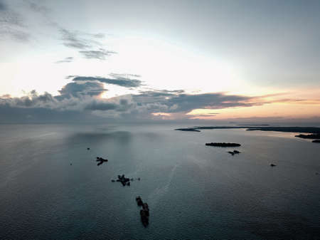 Aerial view of beautiful landscape near the island and sea gypsy water village with the water chalet stilt house during sunrise in Bum Bum island Semporna, Sabah, Malaysia.