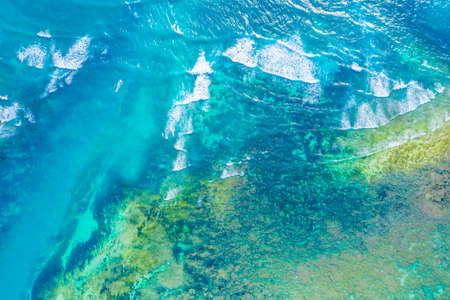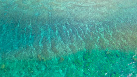 Aerial top view of clear turquoise ocean water with reefs. Nature summer background