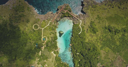 Top down of designed path at azure lake on green cliff sea shore aerial view. Greenery tropical meadow with trees, grasses on ocean coast. Epic landscape of Weekuri landmark, Sumba Island, Indonesia