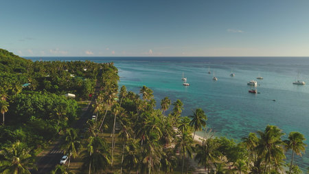Aerial view tropical island road in palm trees. Drone fly over coastline beach and vibrant turquoise ocean, sailboats under bright, clear sky. Popular tourist destination, exotic summer travel