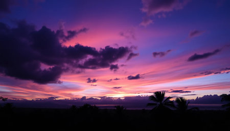 Palm trees silhouettes on tropical beach during colorful sunset.