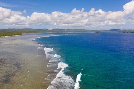 Seascape, coast of the island of Siargao, Philippines. Blue sea with waves and sky with big clouds, top view.