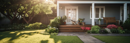 Cassic backyard with idullic lawnand house at sunny day