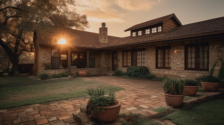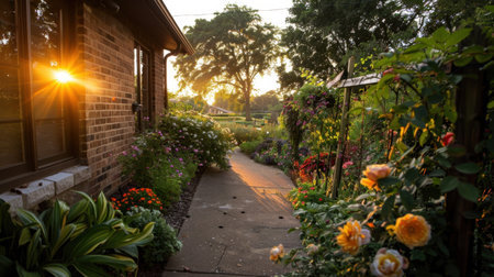 Beautiful garden pathway lined with vibrant flowers and greenery leads to charming house. sun sets in background, casting warm glow over scene, creating peaceful and inviting atmosphere