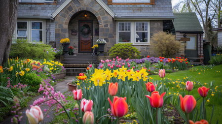 A beautiful display of blooming daffodils and tulips in a front garden, adding a splash of color to the exterior of a quaint house.
