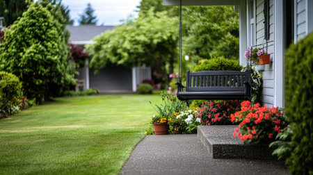 An empty front yard with a cozy porch swing, a trimmed lawn, and flower pots lining the steps. No one is outside