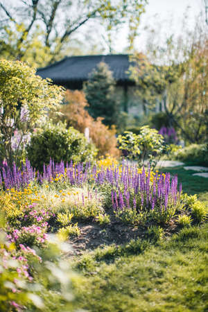 Charming house surrounded by colorful flowers in a beautiful garden during late afternoon light