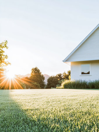 A peaceful morning scene shows sunlight breaking over a cozy house surrounded by lush grass and trees, highlighting the beauty of nature and a new day.