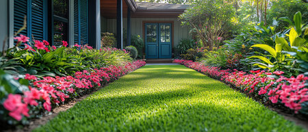Front yard with blooming flowers and manicured lawn, sunny day, welcoming entrance