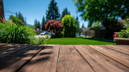 A weathered wooden deck in the foreground leads to a vibrant green lawn, surrounded by lush plants, trees, and colorful flowers, creating a serene backyard oasis.