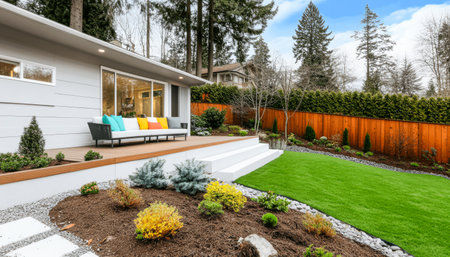 A contemporary backyard showcases a sleek seating area adorned with colorful cushions. Lush green grass contrasts with gravel and well-maintained shrubs creating an inviting outdoor space.