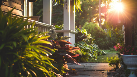 Golden evening sun shining on a variety of lush green plants along a stone walkway by the front porch of a suburban home
