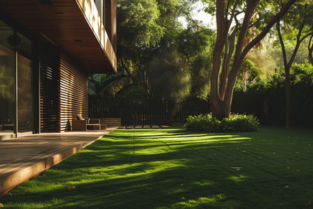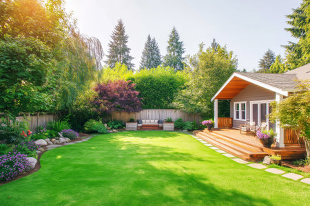 A bright green lawn in a suburban backyard, the perfect background for family activities or peaceful relaxation
