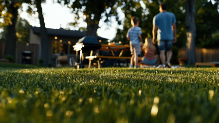 Blurred background of a summer backyard party with barbecue grill, green grass and warm bokeh lights