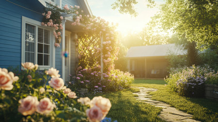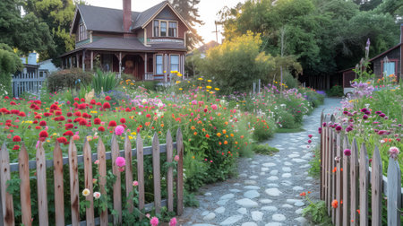 Charming garden pathway leads to cozy house, surrounded by vibrant flowers and lush greenery. warm sunlight enhances inviting atmosphere, creating serene outdoor space