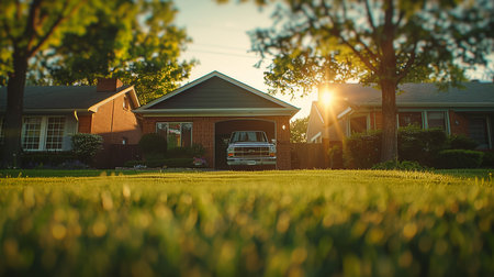 A tranquil modern home surrounded by vibrant green grass and trees, illuminated by the warm glow of the sun, evoking a peaceful outdoor atmosphere.