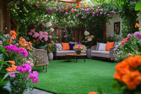 A vibrant garden showcases colorful flowers in decorative pots. A comfortable seating area can be seen amidst lush greenery under the warm afternoon sun, creating a tranquil atmosphere.