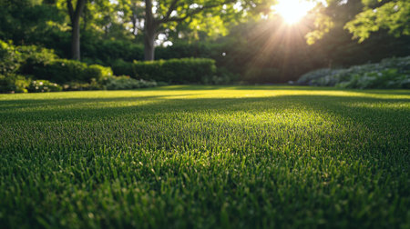 A dense, perfectly maintained green lawn in a backyard setting, with soft sunlight illuminating each blade of grass.