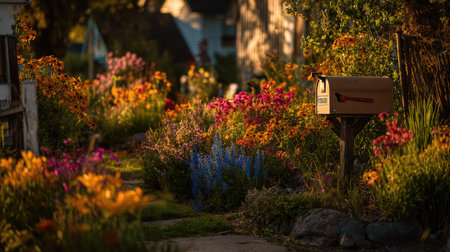 Vibrant flower patch near a mailbox bathed in early morning sunlight