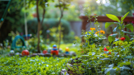 Colorful garden with small toys among plants under sunlight