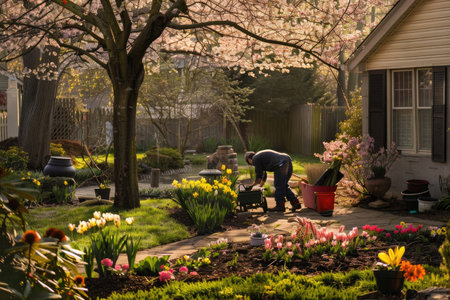 Landscapers transforming a garden into a vibrant spring oasis