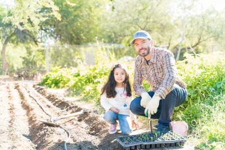 Happy farmer family looking at camera and holding their harvest outdoors in garden.