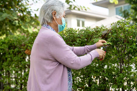 Asian senior or elderly old lady woman wearing mask to taking care of the garden in house, hobby to relax and exercising with happy.