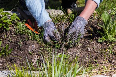 weeds removed by hand wearing gardening gloves, concept of gardening and taking care of your backyard