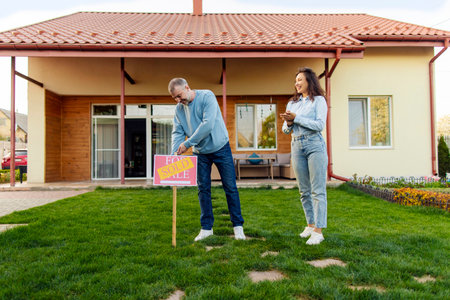 Excited spouses standing in the garden in front of their new house, man removing SOLD sign and woman applauding, full length