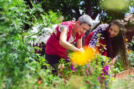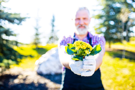 Beautiful nature. Attractive pleasant retired man feeling motivated while taking care of the garden